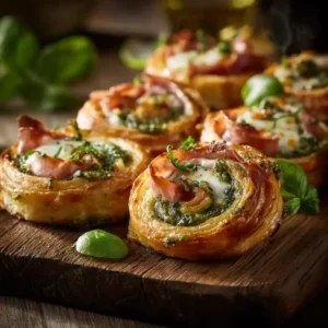 Feuilletés Roulés au Pesto, Jambon et Mozzarella– Succès Garanti